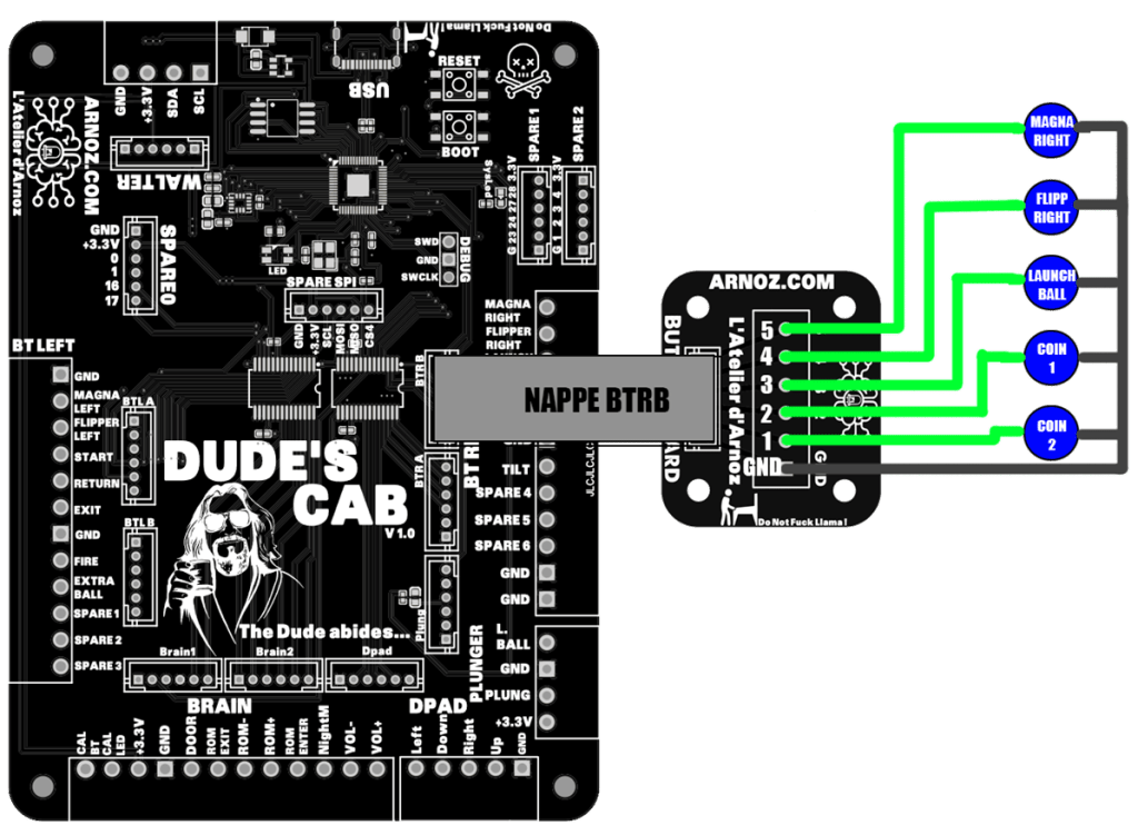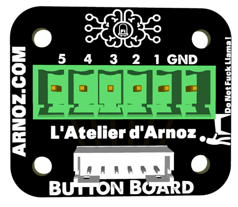 Pour encore plus simplifier votre câblage, vous pouvez utiliser des Button Board, ce sont des petites cartes qui se connectent via une nappe à la Dude’s Cab et qui permettent d’avoir une prise à vis au plus près de vos boutons.