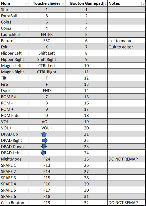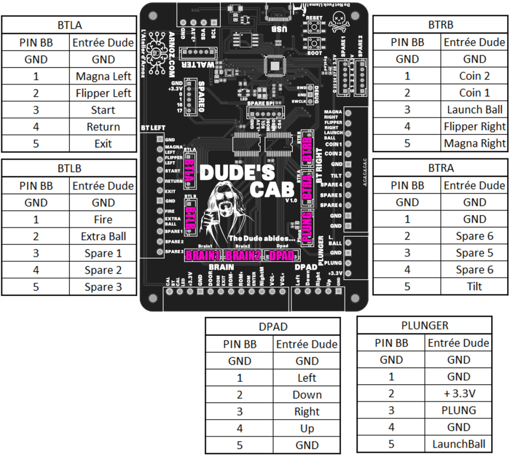Vous disposez des entrées classiques de bouton, plus 4 entrées permettant de naviguer dans les menus (DPAD), 6 prises de spare vous permettant d’ajouter les fonctions que vous désirez, et d’une entrée Calib permettant de calibrer simplement le Plunger.