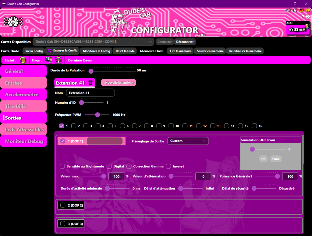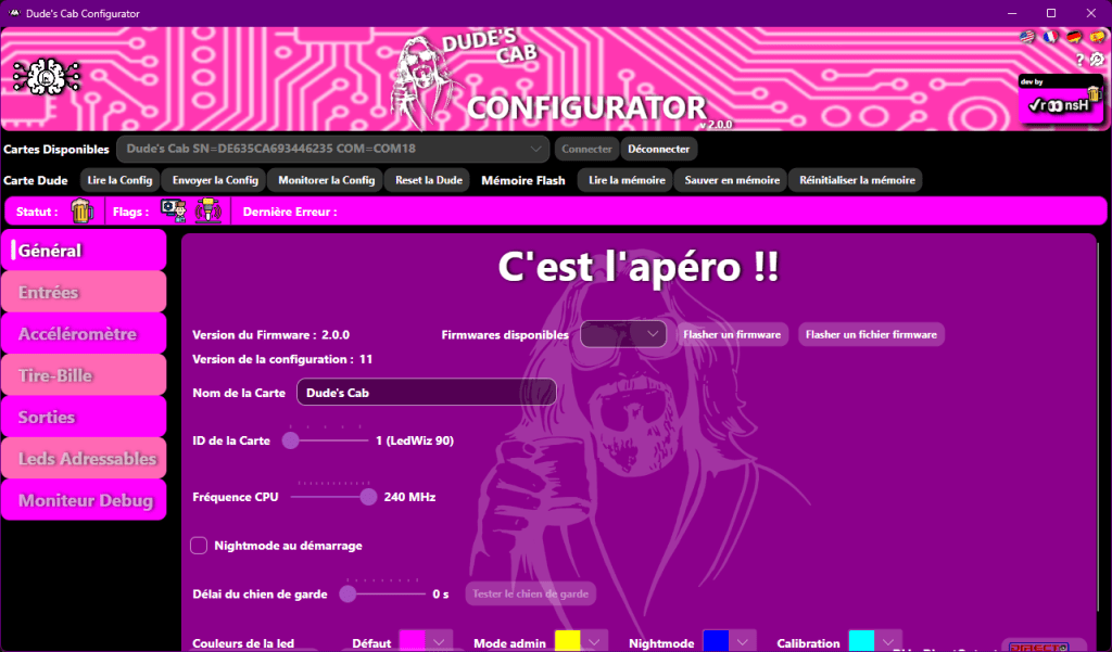 Une fois connecté, les différents onglets apparaissent, et l’on peut aussi voir la version du firmware de la Dude’s Cab.