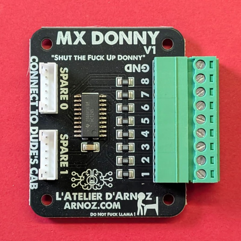 Pour utiliser la MX DONNY, connectez la à votre Dude’s Cab aux prises SPARE 0 et SPARE 1 à l’aide des 2 nappes fournies avec la carte